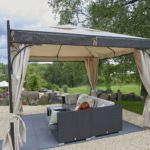 – Erd-Sauna im Außenbereich mit Blick auf den weitläufigen Wellnessgarten mit Liegen und Schaukelliegen zum Ausruhen