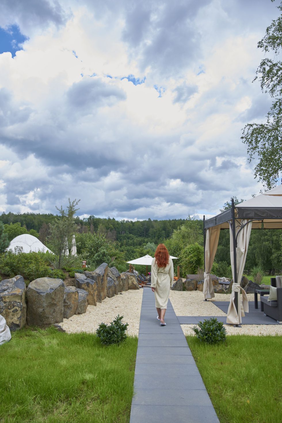 - Erd-Sauna im Außenbereich mit Blick auf den weitläufigen Wellnessgarten mit Liegen und Schaukelliegen zum Ausruhen